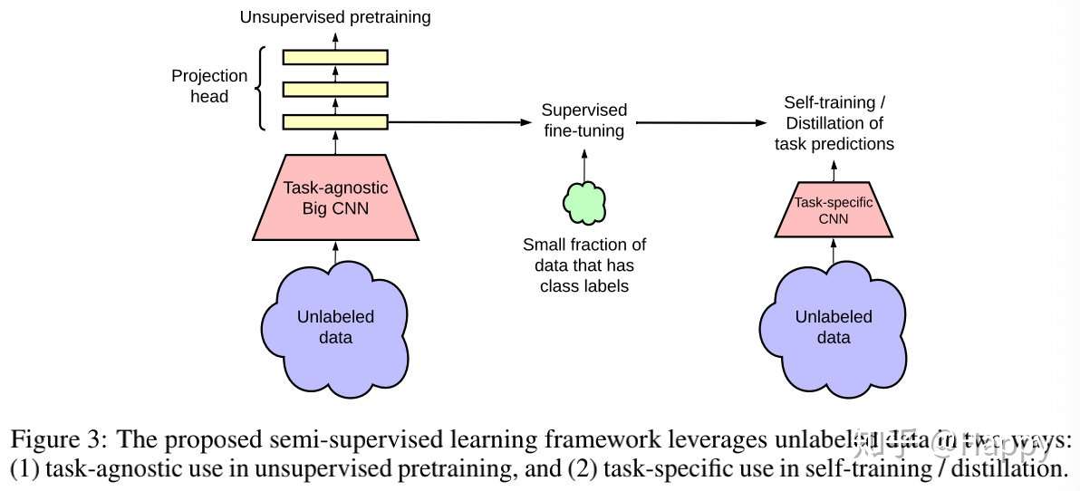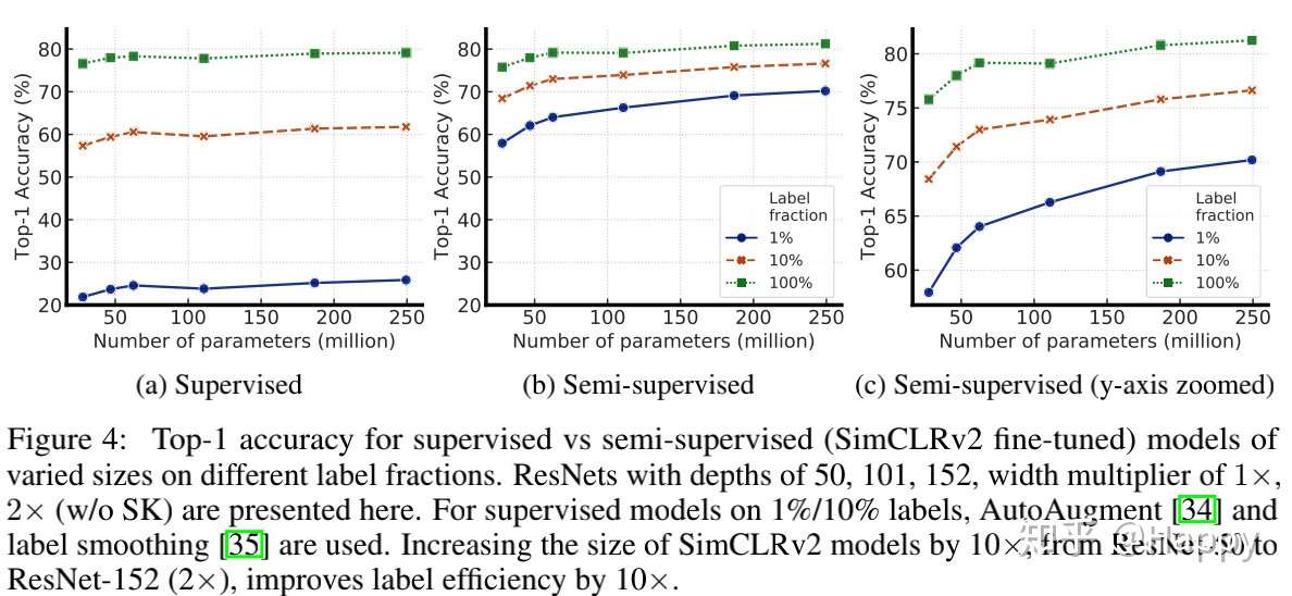 一种从少量带标签数据+大量无标签数据中进行学习的方案是:现在无标签数据集上采用无监督学习方案进行预训练,然后采用监督学习方式在少量带标签数据上进行微调。尽管该方案中的无标签数据上的无监督学习是一种任务不可知方式(不同于其他CV中半监督学习),但是令人惊讶的是这种半监督学习的方案在ImageNet上极为有效。