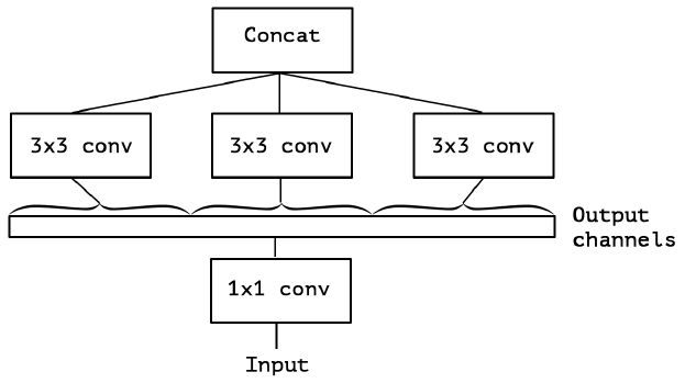 更进一步,作者对于简化后的 $Inception$-$v3$ 模块中的所有 $1$ × $1$ 卷积进行合并,什么意思呢?就是将 $Inception$-$v3$ 模块重新构造为 $1$×$1$ 卷积,再进行空间卷积($3$×$3$ 是标准的那种多通道的卷积),相当于把 $1$×$1$ 卷积后的输出拼接起来为一个整体,然后进行分组卷积。如下图 $3$ 所示: