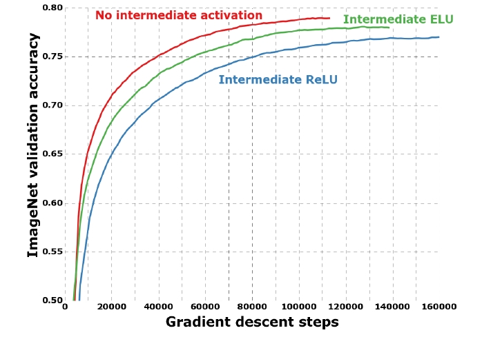 而作者认为第一个区别不大,因为这些操作都是堆叠在一起的;但第二个影响很大,他发现在“$extreme$“版本的 $Inception$ 中 $1$×$1$ 与 $3$×$3$ 之间不用 $ReLU$ 收敛更快、准确率更高,这个作者是做了实验得到的结论,后面我们会介绍。