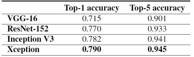 在训练验证阶段,作者使用了 $ImageNet$ 和 $JFT$ 这两个数据集做验证。精度和参数量对比如下图所示,从图中可以看到,在精度上 $Xception$ 在 $ImageNet$ 领先较小,但在 $JFT$ 上领先很多;在参数量和推理速度上,$Xception$ 参数量少于 $Inception$,但速度更快。